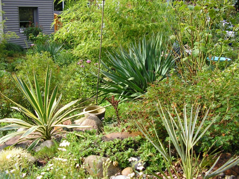Blick vom Hang über Chamaerops hum. cerifera, Yucca gloriosa variegata ,Y. gloriosa x recurvifolia u. Phyllostachys vivax aureocaulis