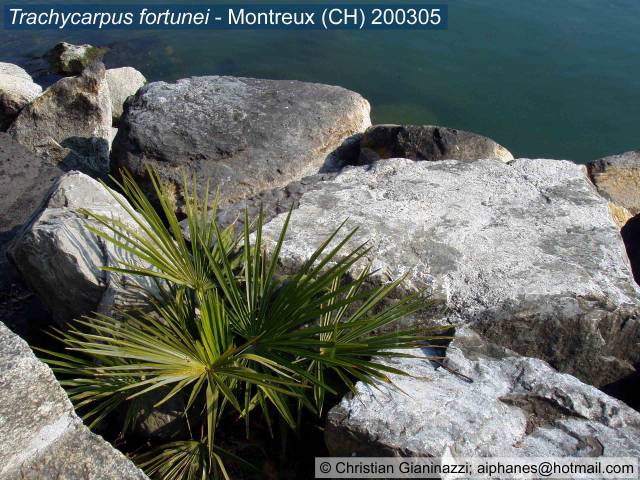 Einsame Trachycarpus fortunei: Zwischen den Gesteinsbrocken am Seeufer gekeimt; hoffentlich steigt das Wasser nicht zu hoch ...
