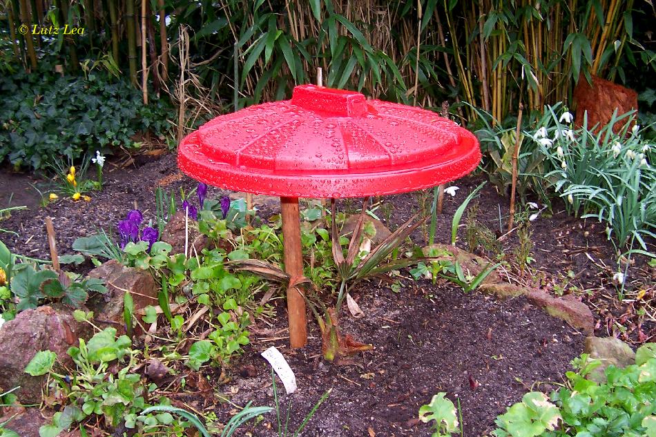 Na ja, in diesem Fall habe ich als eigentlicher Schutzdachablehner auch mal einen kleinen Regenabweiser mittels eines Eimer-Deckels montiert. Da der jüngste Speer fehlt soll nun möglichst kein Regenwasser in den Stammspitzenkrater eindrigen bzw. sich ansammeln können.