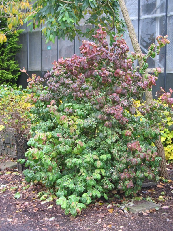 hier noch einmal ohne Mülltonne. Der Weißanteil der Blätter scheint viel langsamer zu wachsen, so dass der Grünanteil blasenförmig gewölbt erscheint. Auch Blatttextur und Habitus erinnern keineswegs an die Stammform. Ich werde wohl Weigelia in dieser Form als Gartenpflanze wieder in Erwägung ziehen.