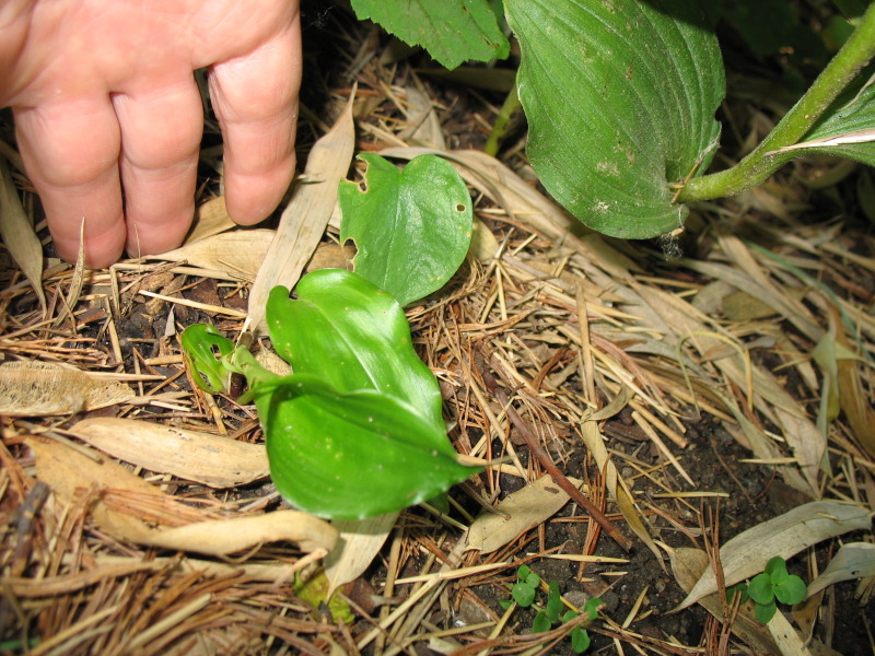 Nur die vorderen Blätter gehören zur Aspidistra. Das Blatt zunächst meiner Hand ist ein Sämling von Arisaema candissima.