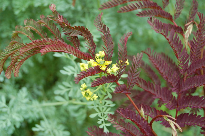 /*Albizzia julibrissin Hot Chocolate*/, in die eine gelb blühende Ruta graveolens hineinwächst