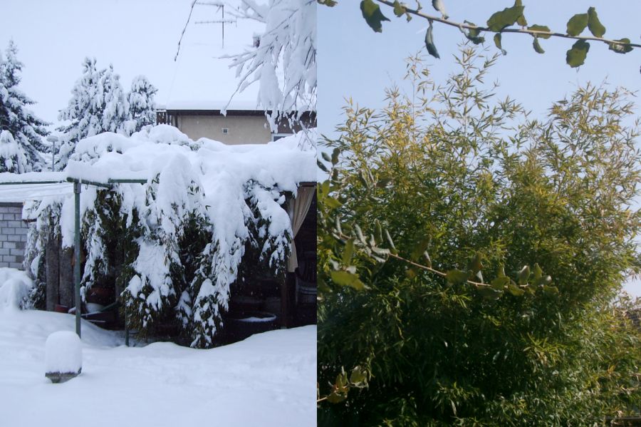 Hier kommen jetzt drei Fotos, einmal Bambus im Schnee, Trachy mit Korkeiche und Steineiche. Links jeweils vom 5.3. und rechts vom 19.3.