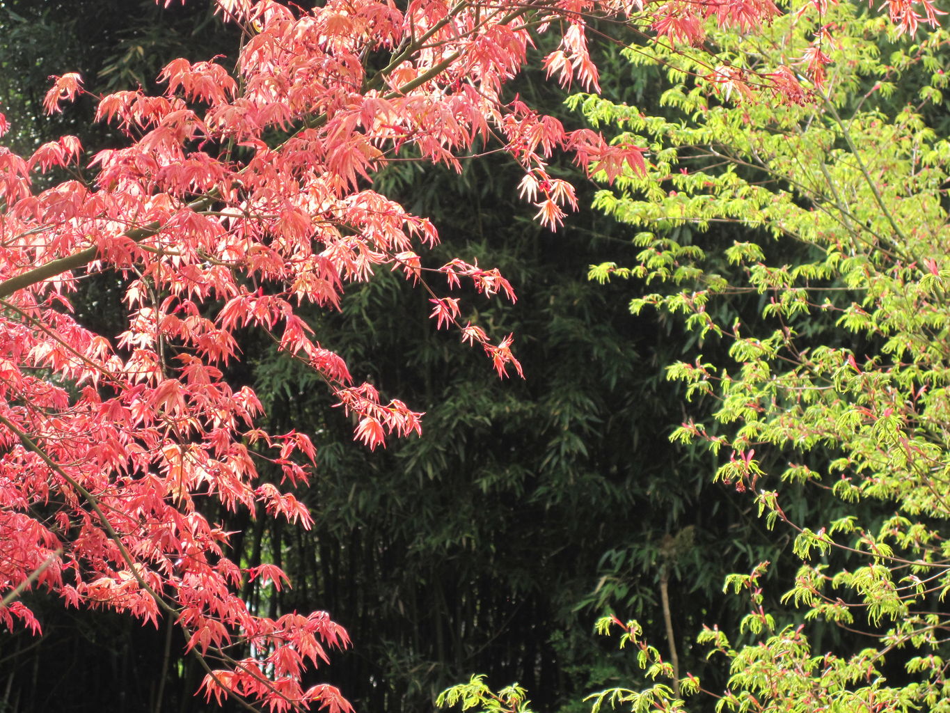 auch im Frühling leuchtend lachsrot:/Acer palmatum Shindeshojo*/ neben Acer palmatum Seiryu#AM