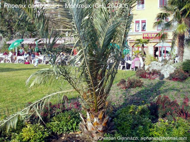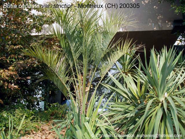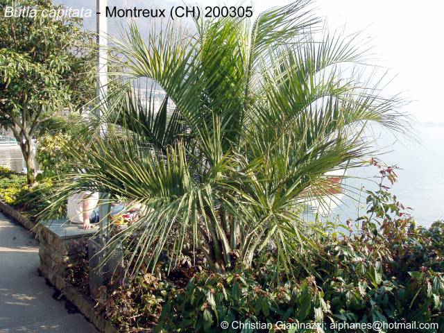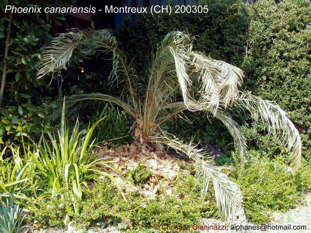 hier noch eine kurze Dokumentation bezügl. der Winterhärte von Butia capitata und Phoenix canariensis am Beispiel von Montreux (Winter 2004/05). Es wurde hier einmal erwähnt, dass es zwischen Butia capitata und Phoenix canariensis keinen grossen Unterschied gäbe bezüglich der Winterhärte, beide seien bis –10/-12C frosthart. Anhand des hier gezeigt Bsp. von Montreux möchte ich aber zeigen, dass in gewissen Situationen, wie eben während des für Montreux relativ kalten Winters 2004/05 mit einem absoluten Minimum von –9/-10C und einigen Eistagen am Stück, Butia capitata sich als „härtere“ Palme erweist. Die Bilder zeigen jeweils nur je 2 Exemplare jeder Art, aber sie sind repräsentativ für die Situation, die ich im März 2005 in Montreux vorgefunden habe. Der Schutz bestand aus Vlies, das um die Palme gewickelt wurde; es wurde keine Wärmequelle angebracht. Die Exemplare in Montreux sind jedoch noch nicht richtig ausgewachsen, und die Aussage, Butia capitata und Phoenix canariensis seien gleich „hart“ bezog sich damals auf ausgewachsene Palmen, wenn ich mich nicht täusche.