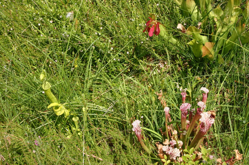hier einige Sarracenia-Arten in einem kuenstlichen Garten-Hochmoor. Begleitpflanzen sind u. a. Besenheide (Calluna vulgaris), Glockenheide (Erica tetralix), Grosse Moosbeere (Vaccinium macrocarpon), Rosmarinheide (Andromeda polifolia). Hinten der Rest des Fruchtstands des Schmalblaettrigen Wollgrases (Eriophorum angustifolium). Sarracenia purpurea ist winterhart. Die anderen wurden mit einem umgedrehten Maurerkuebel, der mit geknuelltem Zeitungspapier ausgefuellt war, gegen Bodentemperaturen im letzten Winter von bis zu �21Grad C geschuetzt.