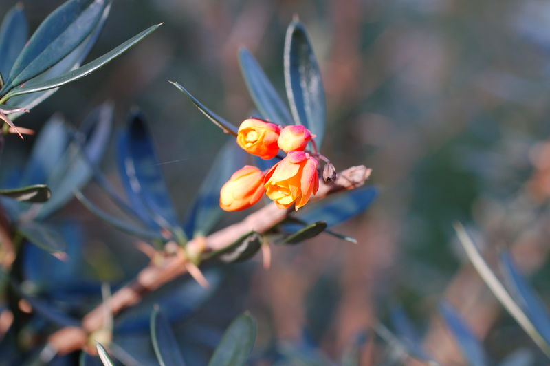 An den Einzelblüten erkennt man die enge Verwandtschaft zu den Mahonien,hier die immergrüne /*Berberis linearifolia Orange King*/