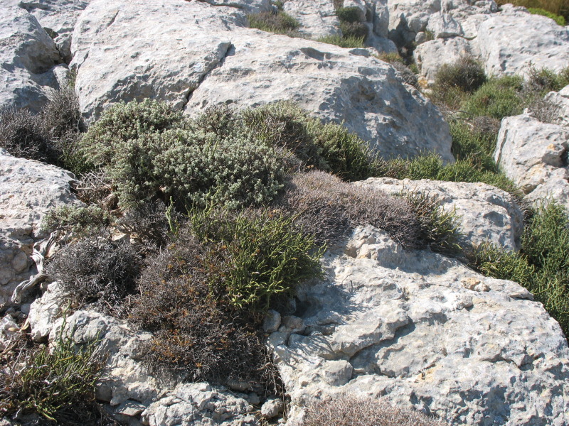 Polster bestehen oft aus mehreren inneinander verwobenen Arten, hier Teucrium subspinosum, Smilax aspera und Santolina