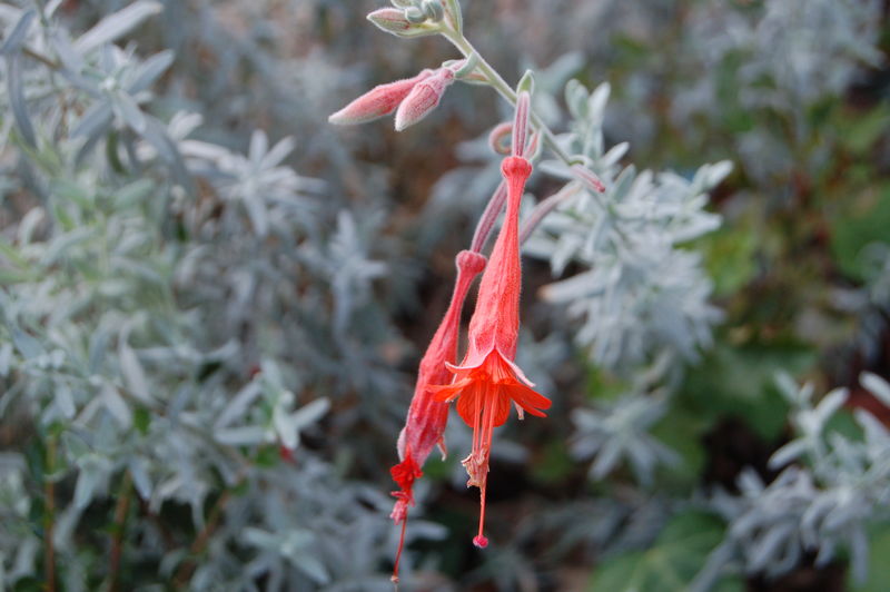 Diese /*Zauschneria californica*/-Art ist deutlich höher,als die zuletzt gezeigte, hat fast weißliche Blättchen und blüht fast 3 Wo später. Genaue Sortenbezeichnung???