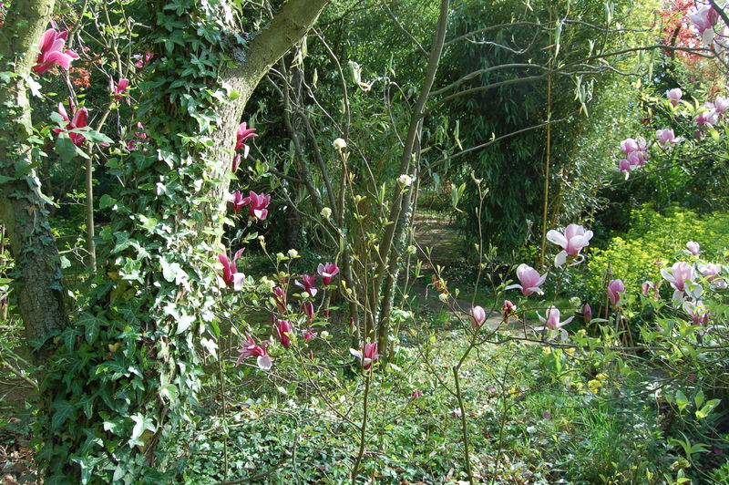 ....allerdings 1 noch ohne Blatt und Blüte (M.tripetala).Li /*Magnolia liliiflora nigra, re eine Soulangiana-Selektion,daneben m.stellata rubra. Li der dicke Stamm gehört einer Quercus turneri Pseudoturneri