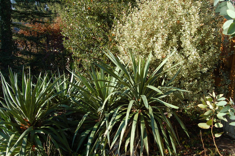 diese alte /*Yucca recurvifolia*/ ist über 30 Jahre alt. Im Hintergrund - gut 3-4m hoch- Quercus phillyreoides und Rhamnus alaternus argenteovariegatus