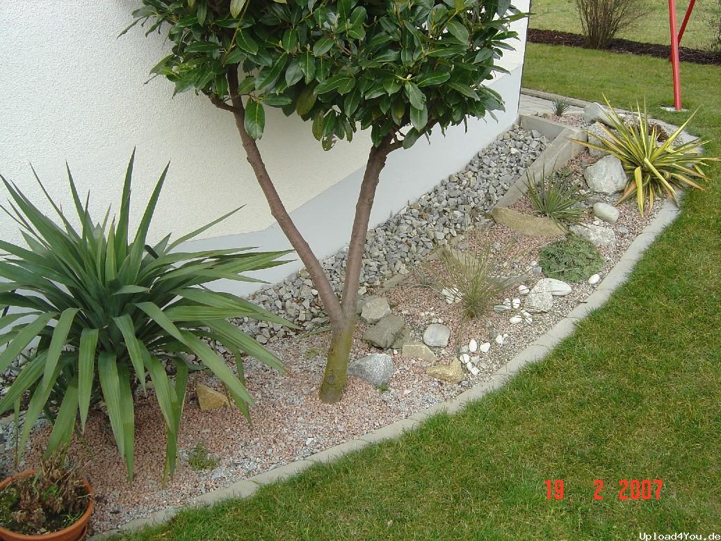Dieser Teil des Gartens ist der trockenste – Ostseite mit Dachvorspung. Ideal für Yuccas und Agaven. Von links: Yucca recurvifolia, hinter dem Stamm schlecht erkennbar Yucca aloifolia, Opuntia kleiniae, Yucca campestris, Yucca rostrata, 2 kleine Agaven parryi, Yucca thomsoniana, Yucca filamentosa 'Color Guard', Yucca brevifolia v. jaegeriana. In der Mitte ein gewöhnlicher Kirschlorbeer, der schon gewaltig austreibt.