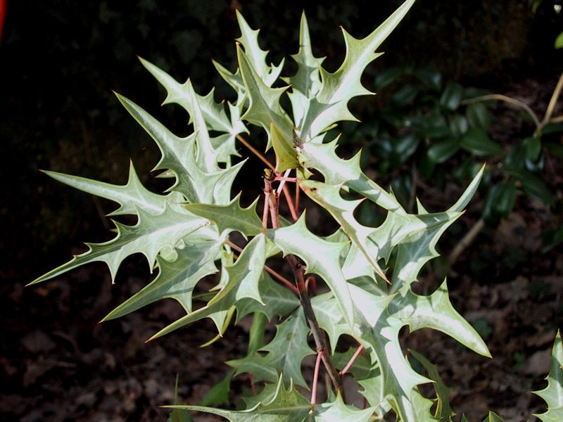 Exotisch bizarr: die stahlblauen Blätter der californ./mexik. Mahonie.Wunderschön auch der Kontrast zu den rötlichen Ästen(Auspflanzversuch 2005)