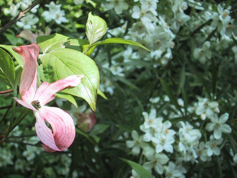 eine rosa-farbene Selektion des amerik. Dogwood vor einer fast 2m hohen(!) blühenden Choisya ternata Aztec Pearl