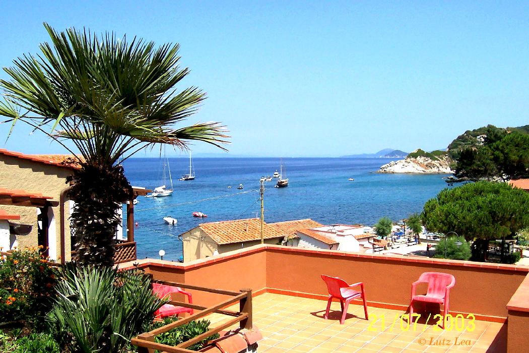hier als Nachtrag noch ein Bild von der Terrasse des "Hotels Barsalini" auf Elba, in 'Capo San Andrea', mit Blick auf das Meer und den Felsstrand.