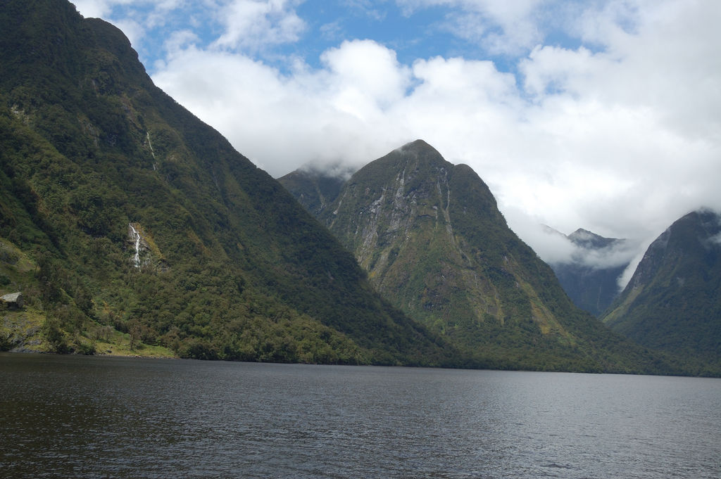 ...Fjord-Landschaft vom Meer aus gesehen, mit jenen seltenen Augenblicken, die einen blauen Blick nach oben ermöglichten