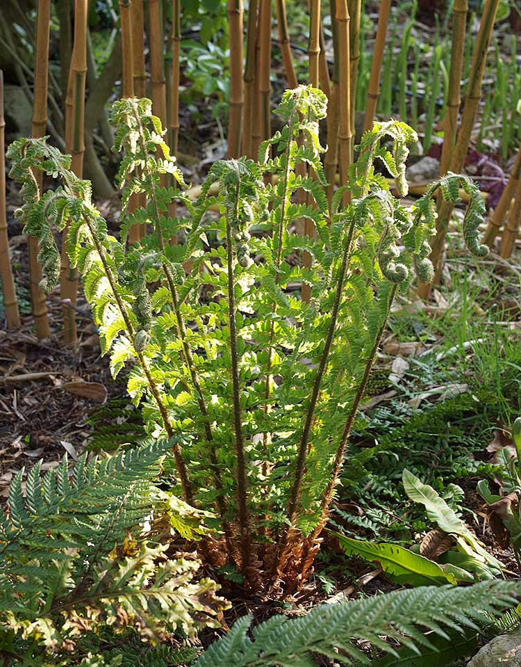 Der Austrieb von/*Polystichum x wirtgenii*/im Gegenlicht,die Naturhybride zwischen Polystichum braunii x Polystichum setiferum.