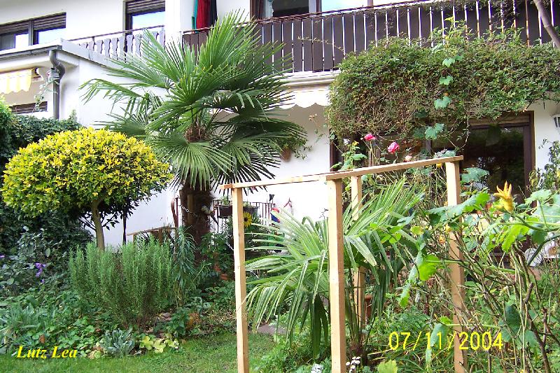 Die große Trachy im Hintergrund bekommt nur Wurzelmulchung mit Laub und Tannenreisig. Bei zu erwartendem starken Schneefall und Kälte binde ich schonmal die Wedel zusammen - aber nur ungerne.