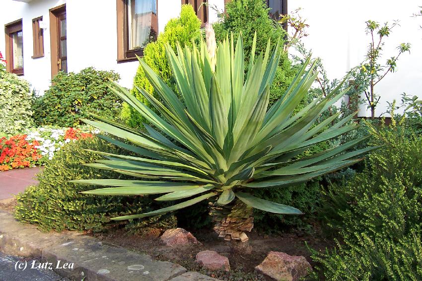 die von mir hier schon öfters vorgestellte 'Yucca gloriosa' in Nachbars Vorgarten mit den sehr breiten und extrem steifen Blättern aus Portugal, schiebt nach drei Jahren das erste mal einen Blütenstand (Anfangsstadium) empor (!!!).