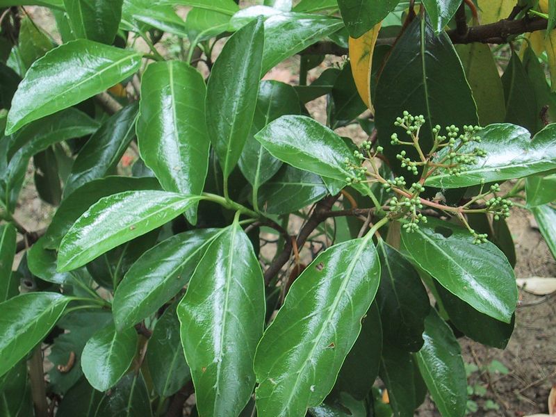 Erstmals mit angesetzter Blüte: der asiat. immergrüne Glanz-Duft-Schneeball.Nur die in Holland erworbene Selektion Awabuki (die sehr stark lackartig glänzt) hat die letzten Winter ohne Schäden überstanden.Die in einigen Gartencentern zu bekommende Vib. odor. oder "lucidum" aus italien. Baumschulen ist hier bei uns absolut nicht winterhart!!