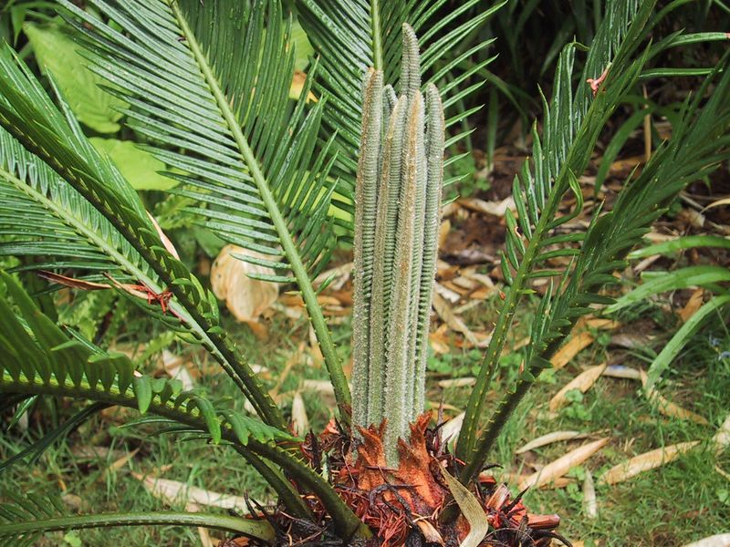 Zwar nicht so schön im Blatt- wie oben Dioon spinulosum- aber immer wieder beeindruckend "archaisch" der symmetr.Blattaustrieb! Diesmal sind es 10 neue Blätter