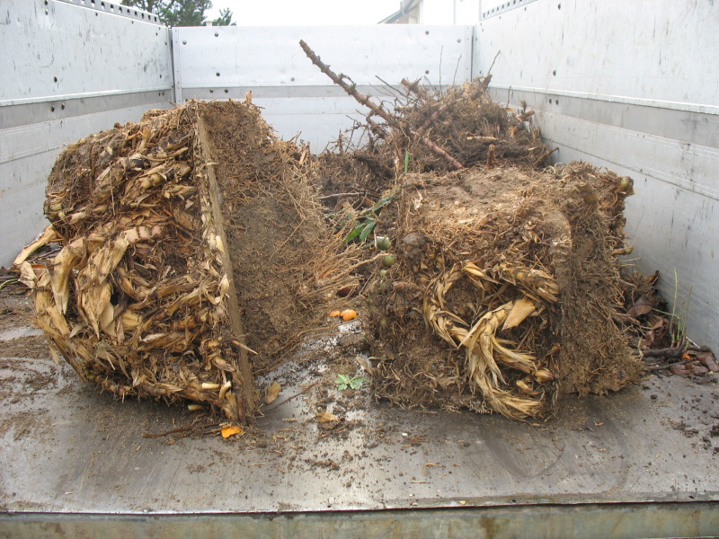 die letzten Rhizomklumpen vor dem Abtransport. Man erkennt rechts sehr schön wo die Mauer ursprünglich stand und dann die massiven Rhizomwucherungen welche den enormen Druck ausübten und das Mauerwerk immer mehr in Nachbars Garten verschoben.