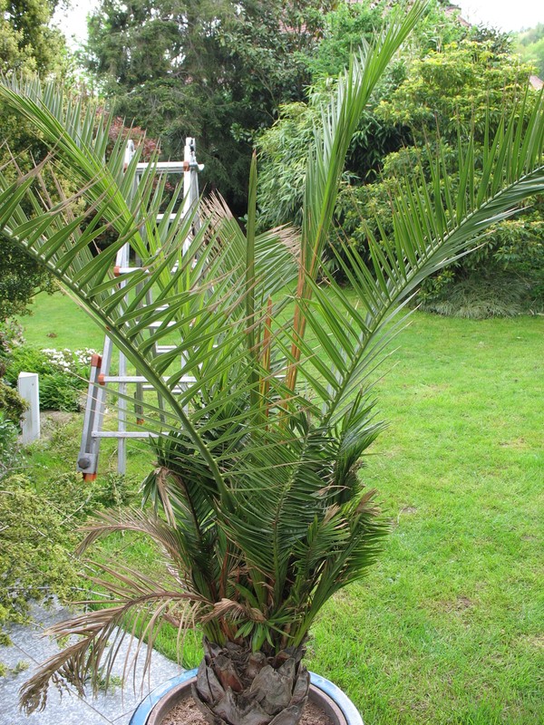 heute bei der Gartenpflege fiel mir die Kübelpalme auf der Terasse des Hauses auf: da erscheinen rund um den Haupttrieb jede Menge noch bonsaiartig kleine und verdrehte Neutriebe.