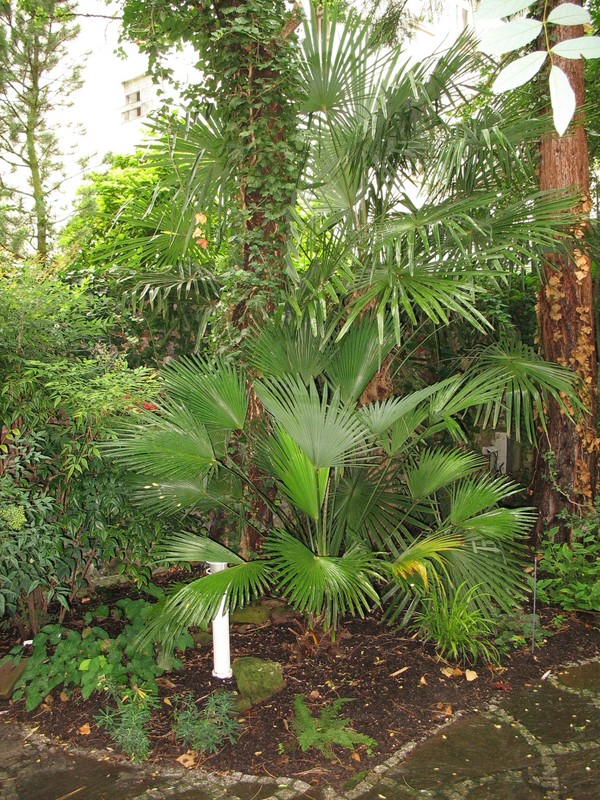 dieser T. wagnerianus wurde als kleine Pflanze hier ausgepflanzt und entwickelt sich bedingt durch Wurzeldruck und magere Bodenverhältnisse außerst langsam mit kaum Stammzuwachs. Bedingt durch den Lichtmangel sind die Blätter relativ groß und langstielig und das hat durchaus seinen Reiz. Erinnert irgentwo fast an diverse Licualas.