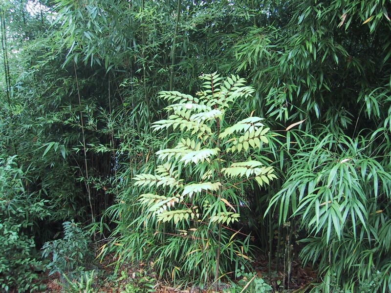 Cedrela (früher Toona) bietet nicht nur im Frühjahr (lachsroter Austrieb!!) einen attraktiven Anblick! Hier vor einem Bambushain mit versch.Bambusarten