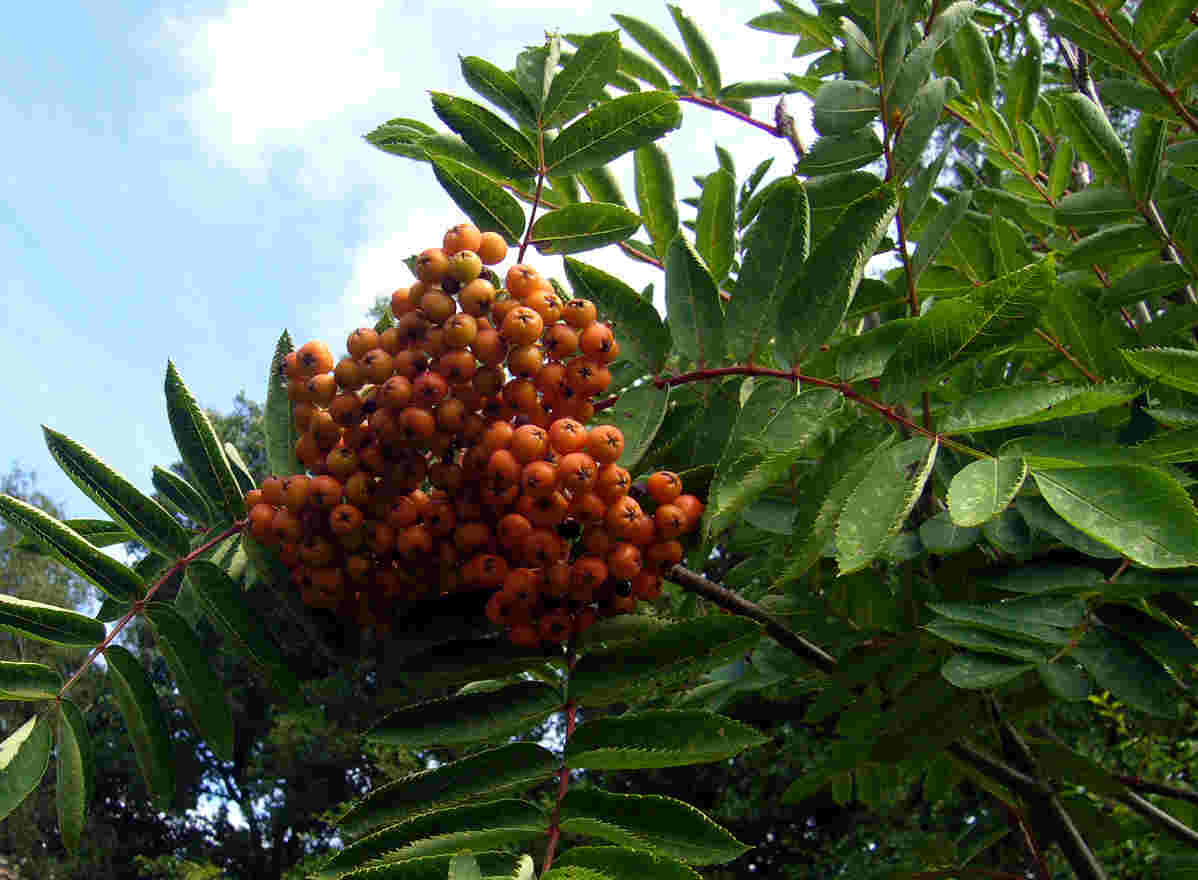 ..Meine besondere Liebe gilt der Gattung Sorbus, von der ich recht viele Vertreter hier versammelt habe. Hier die nordamerikanische /*Sorbus decora*/ mit wuchtigen Rispen. Noch nicht ganz reif, und daher noch nicht in Amselmaegen verschwunden...