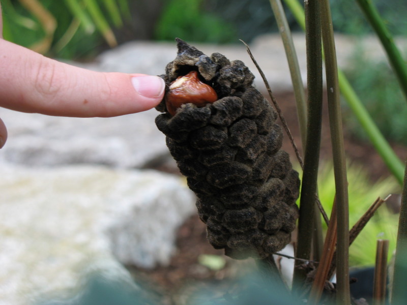 heute entdeckt: was schaut denn da aus dem Zapfen einer Zamia (pumilio ?). Zamias bilden im Gegensatz zu anderen Palmfarnen recht häufig Zapfen aus, doch im Unterschied zur Gattung Cycas erfordert bei den anderen Cycadeen des Erkennen des Geschlechts ziemliche Erfahrung. Um so mehr bin ich erstaunt, dass es da anscheinend ganz unverhofft "geschnackelt" hat