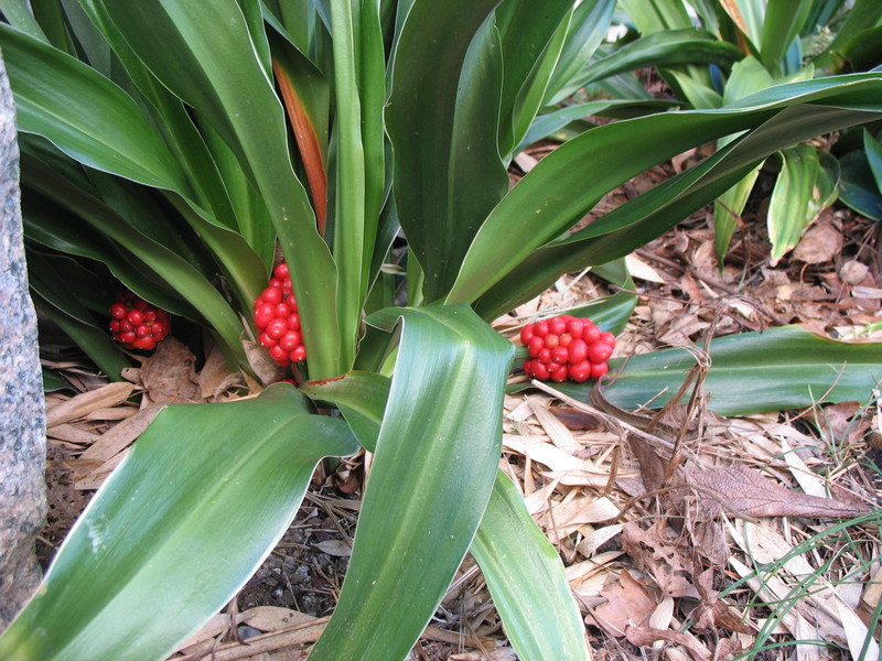 bringt Rohdea japonica. Fruchtansatz wie noch nie, leider stecken die meisten Fruchtkolben gut versteckt im Innern der Blattrosetten.