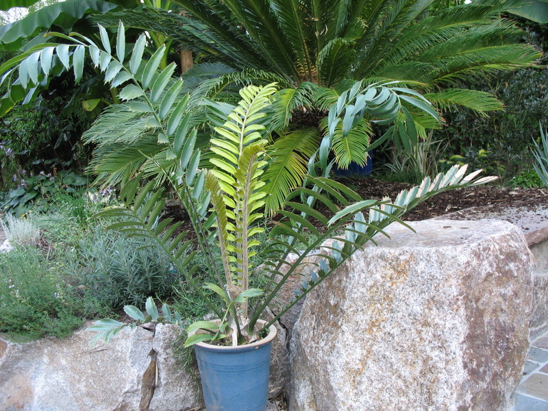 Erstaunlich, dass dieser Palmfarn aus Ostafrika, wo er eigentlich in hochtropischen Klima in Äquator- und Meeresnähe gedeiht, hier als Kübelpflanze überhaupt aushält. Allerdings Riesensrünge macht er natürlich nicht in unserem Klima.