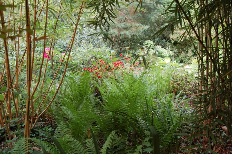 Trichterfarne zwischen Phyllostachys bambusoides Castillonii li u. Fargesia robust. Hi:die blaugraue Selektion von Sequoiadendron (gig. glaucum)