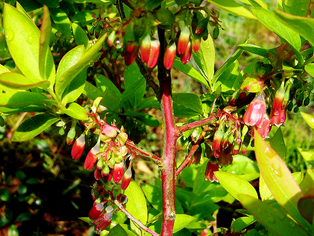 /*Vaccinium arctostaphylos*/ ist eine heidelbeerartige Pflanze aus dem Kaukasus, etwa 1 m hoch und mit auffallenden roten Glockenblueten und schwarzen Beeren. Sie hat sich hier als voellig hart erwiesen.