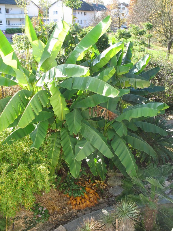 bei meinen Musas. Wie lange noch??? Bis Weihnachten hats schon zwei Mal gereicht, doch die Feiertage hat sie noch nie grün überstanden. Im Hintergrund M. sikkimensis - von oben kaum von M. basjoo - vorne - zu unterscheiden.