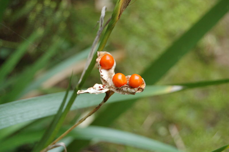 Die immergrüne, mediterrane /*Iris foetidissima*/ist auch im Herbst durch ihre leuchtend orangefarb. Samen interessant