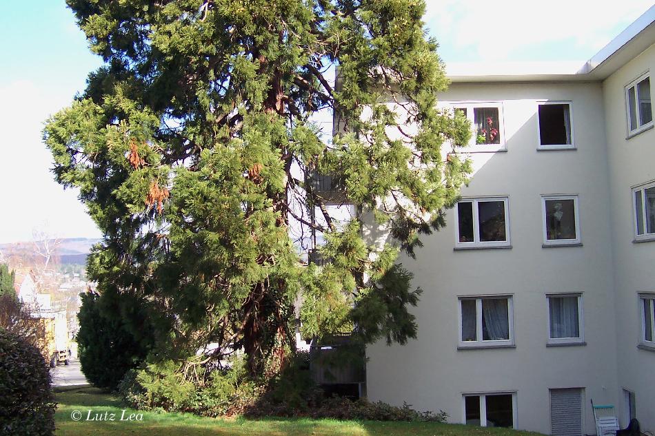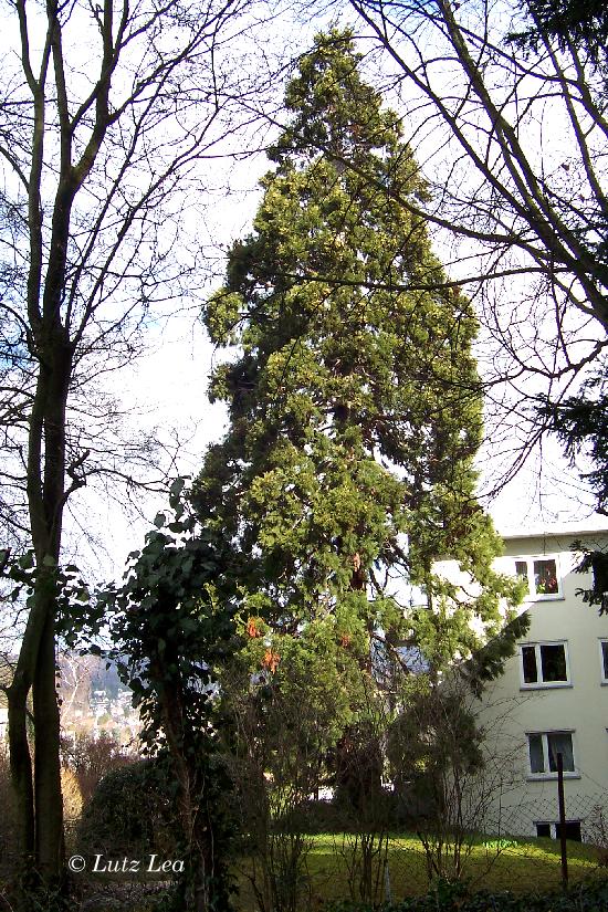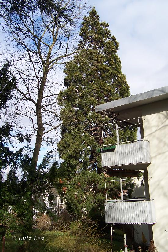 Wie mir ein Anwohner erzählte, soll der Baum schon einmal sein rieiges Wurzelsystem unter das Haus getrieben haben und ein Abwasserrohr zum Bersten gebracht haben! Da waren einige Arbeiten nötig. Trotz allem darf der Riesenkonifere nicht zu Leibe gerückt werden!