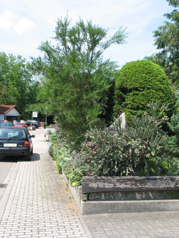 Die Kakteen müssen jedes Jahr entlang des Bürgersteigs stark zurückgeschnitten werden und das Foto läßt erahnen warum: der Vorgarten gehört zu einer Krankengymnastikpraxis in der besonders auch Babies versorgt werden. Dabei spielen sich täglich folgende Scene ab. Mama steigt aus, geht ums Auto rum um den Nachwuchs aus dem Babysitz auf der Beifahrerseite zu nehmen. Wobei man sich tief bücken muss, den Popo weit nach hinten gestreckt, ... und dann "AAAuuuutsch...". Nein, nicht nur Bambus hat seine Tücken!