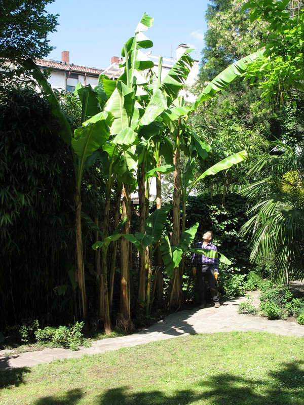 die Musa in dem - hier schon öfter gezeigten - Garten in der Karlsruher City ist zwar ordentlich vom Sturm zerfleddert, lässt aber auf Grund der jetzigen Größe noch einiges bis zum Spätsommer erwarten. Rechts am Bildrand die weibliche Pflanze der kürzlich gezeigten Trachycarpus-Gruppe