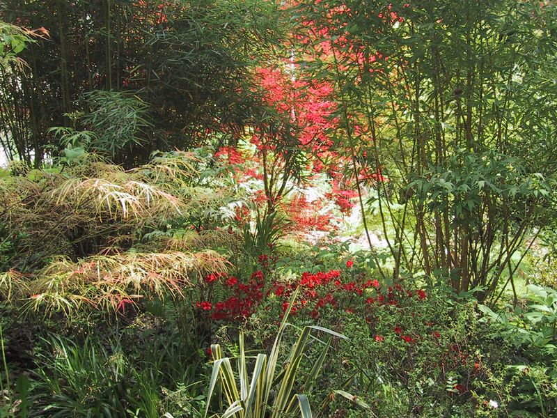 Der feinblättr. Ahorn zwischen Fargesia robusta li u. Phyll. bambusoides Castill., im Hintergrund Acer pal.Shindeshojo