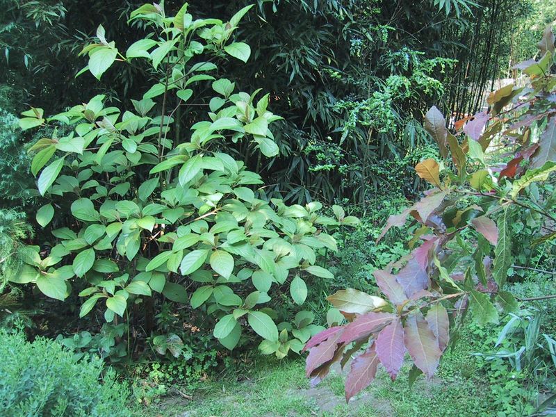 Von Ernest Wilson als eines der schönsten chin. Blütengehölze bezeichnet (hat leider erst 1X in Europa geblüht!!!) li im Bild mit magnolienähnl. sehr großen Blättern,die im Austrieb kupferfarben erscheinen.Dahinter die südamerik. immergrüne Nothofagus dombeyi (ebenfalls ca 3m hoch) re vorne Quercus rhysophylla