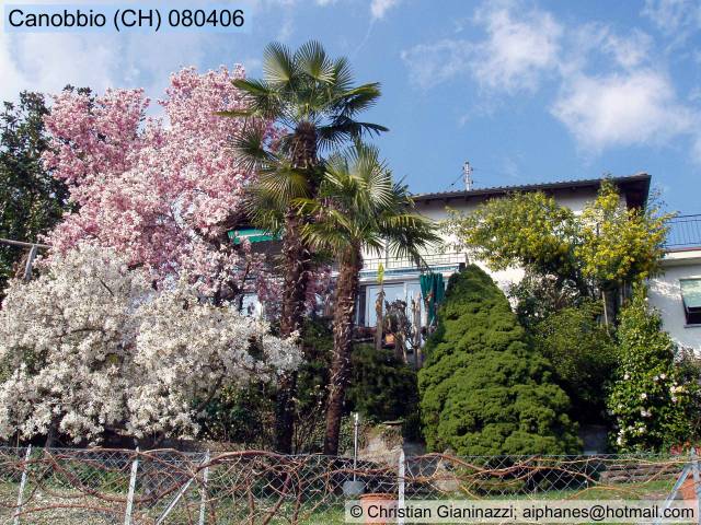 Und hier das Bild von einem Nachbarsgarten mit blühenden Magnolien (links), einer blühenden Acacia dealbata (rechts oben) und einer Kamelie (rechts unten). Zwischen der Konifere und den Trachies erkennt man die (im Winter ungeschützten) Pseudostämme von Musa basjoo, wobei der eine schon ziemlich am Austreiben war. Die Musa basjoo-Stämme in weiteren Gärten in der Umgebung waren alle trotz des vielen Schnees i.O.