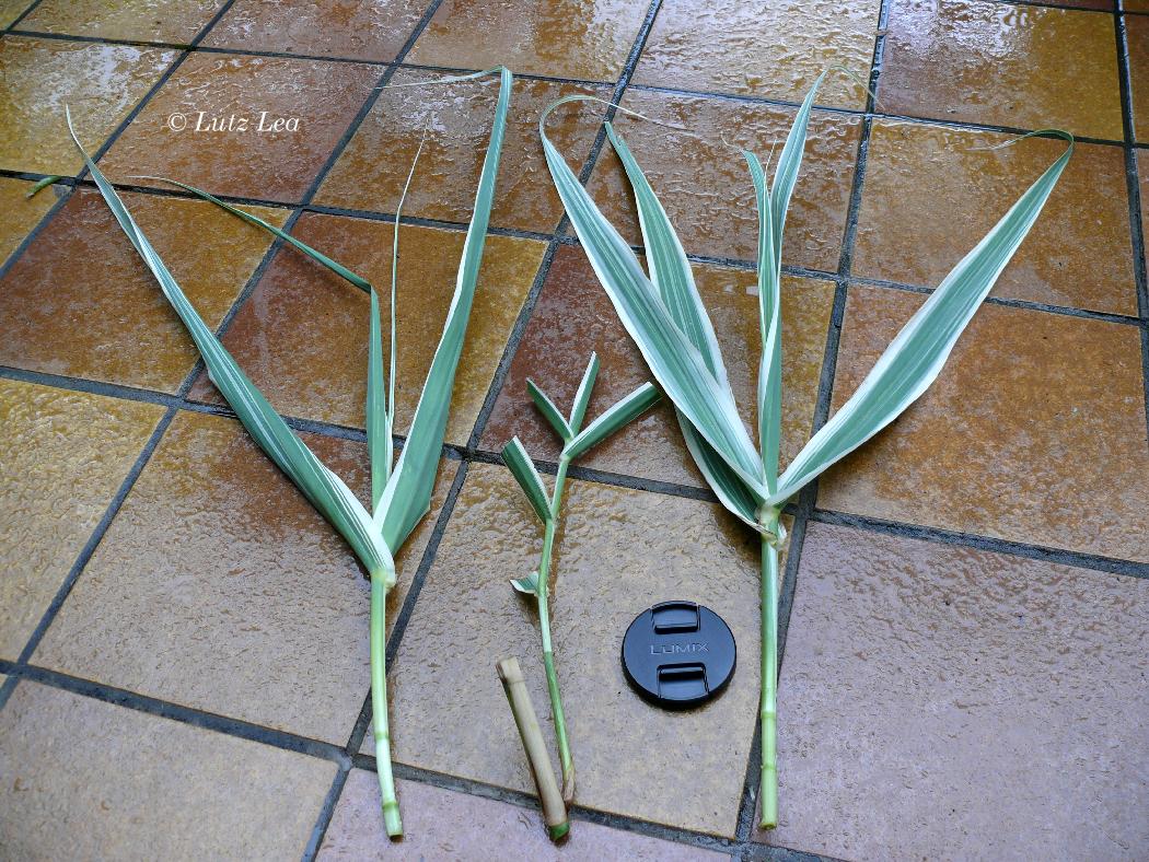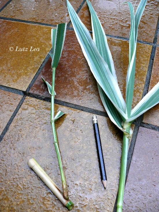 Zum "Glück" lagen zwei abgeknickte Stiele auf dem Gehweg (wirklich), die ich mitnahm zum eventuellen bewurzeln und bestimmen - geht das überhaupt? An dem Stück vielleicht mit der Verzweigung (Knoten)!
