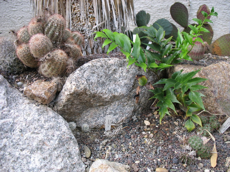auch hier macht sich einiges selbständig. Nicht nur, das an den unmöglichsten Stellen Echinocereus-Sämlinge aufgehen oder Agaven-Ausläufer erscheinen. Sehr verwundert bin ich darüber, dass der Farn Cyrtonium falcatum sich ausgerechnet an der heißesten und trockensten Stelle des Gartens angesport hat und noch dazu überaus prächtig gedeiht. Vielleicht müssen wir das was wir über die Standortansprüche dieses Farnes wissen einmal kräftig überdenken.