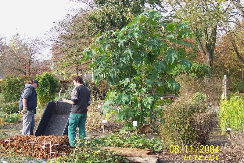 Gleich zu Anfang fiel mir ein im Mai als Jungpflanze gesetzter Wunderbaum 'Ricinus communis' auf, der an Höhe und Breite so ziemlich alles übertrumpft was ich in der BRD bisher gesehen habe. Der fast baumartige Großstrauch ist gut und gerne an die 3-3,5 m hoch geworden!