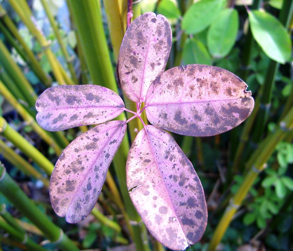 Die Akebie, auch Blaugurkenwein oder Schokoladenwein genannt /*Akebia quinata (Thunb.)Decne.*/ kann als semi-immergrüne Art durchaus eine ganz eindrucksvolle und so unerwartete Herbstfärbung der fünffingrigen Blätter zeigen, wie hier als Leoparden-Akebie mit Leopardmuster auf rosaviolettem Untergrund:
