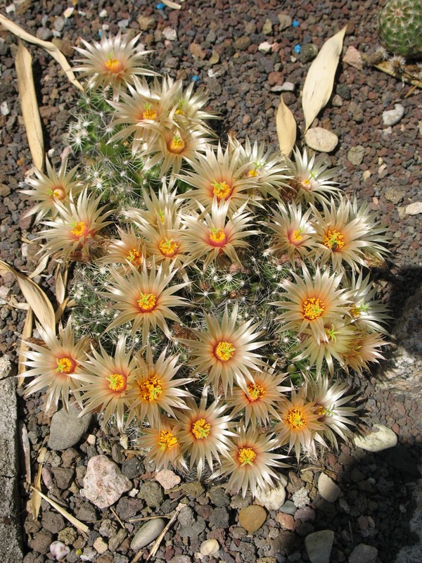 /*Escobaria (Neobesseya) missouriensis, eine weitere Pflanze mit dunklerer Blüte. Dass in diesem Garten auch noch Bambus gedeiht ist leider unübersehbar. Hier im Xerophytenbeet können dessen Emissionen durchaus auch einmal lästig werden!