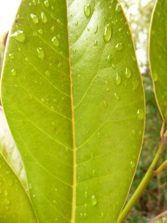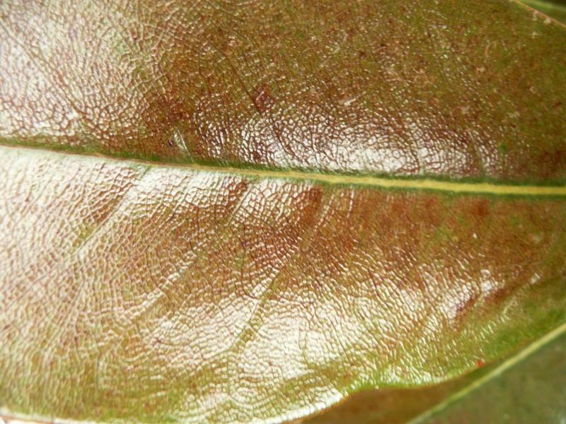 Diese /*Magnolia grandiflora*/ hatte auffällige Strahlungsschaden an der stark glänzenden Blattoberfläche - mal aus der Nähe betrachtet: