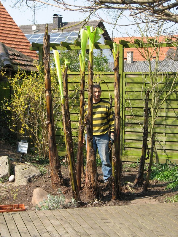 und gestern eine weitere M. basjoo ausgepackt. Diese Pflanze hat in den letzten Wintern immer auffällig - trotz gleichem Schutz - geschwächelt (Meristempflanze??), aber diesmal, nach dem Mildwinter top: der höchste Scheinstamm mit 270 cm.
